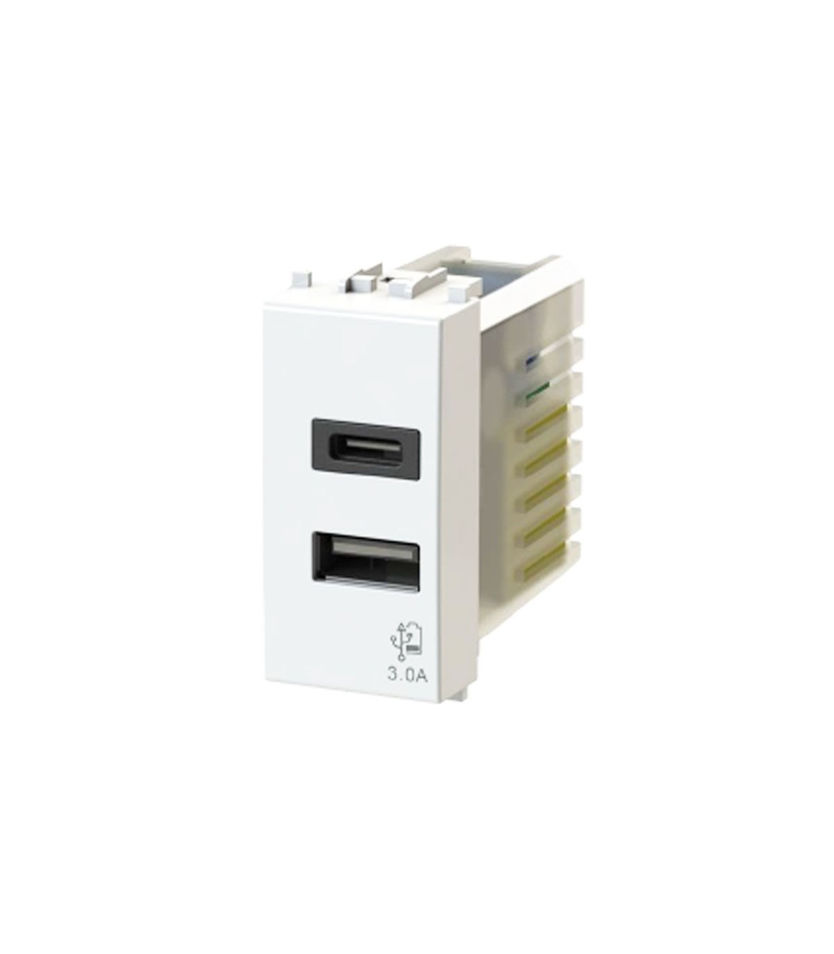 USB-Steckdose Serie 4Box 3.0A mit 2 Ausgängen auf 1 Modul. Ausgestattet mit dem neuen Typ-C-Stecker. Kompatibel mit der Bticino Matix Serie. Weiße Farbe.
