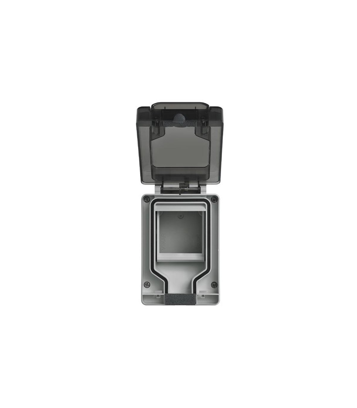 Vimar wasserdichter Wandbehälter mit eingestecktem Stecker, 2 Module. Ermöglicht den Einbau von 2 Modulen der zivilen Serie Eikon, Arké oder Plana. Schutzart IP66 garantiert auch bei eingestecktem Stecker.