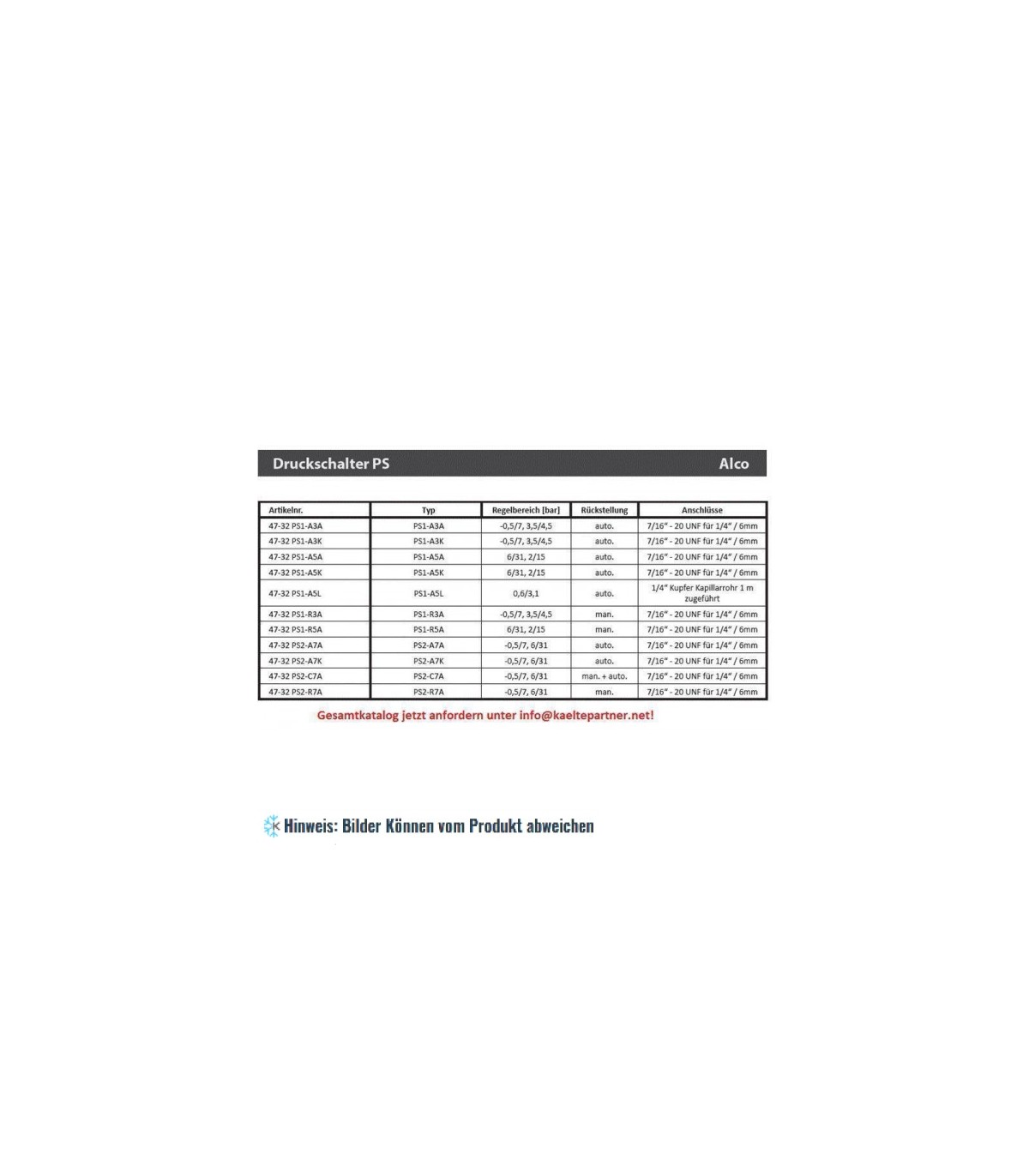 Doppeldruckschalter PS2-A7K, 4350900 Alco, kombinierte Nieder-/Hochdruckschalter. Oberer Schaltpunkt links -0,5 / 7 bar, rechts 6/31 bar, p1 m Kapillarrohr, Messingnippel mit Schraderventilöffner, und 7 /16”-20 UNF Mutter