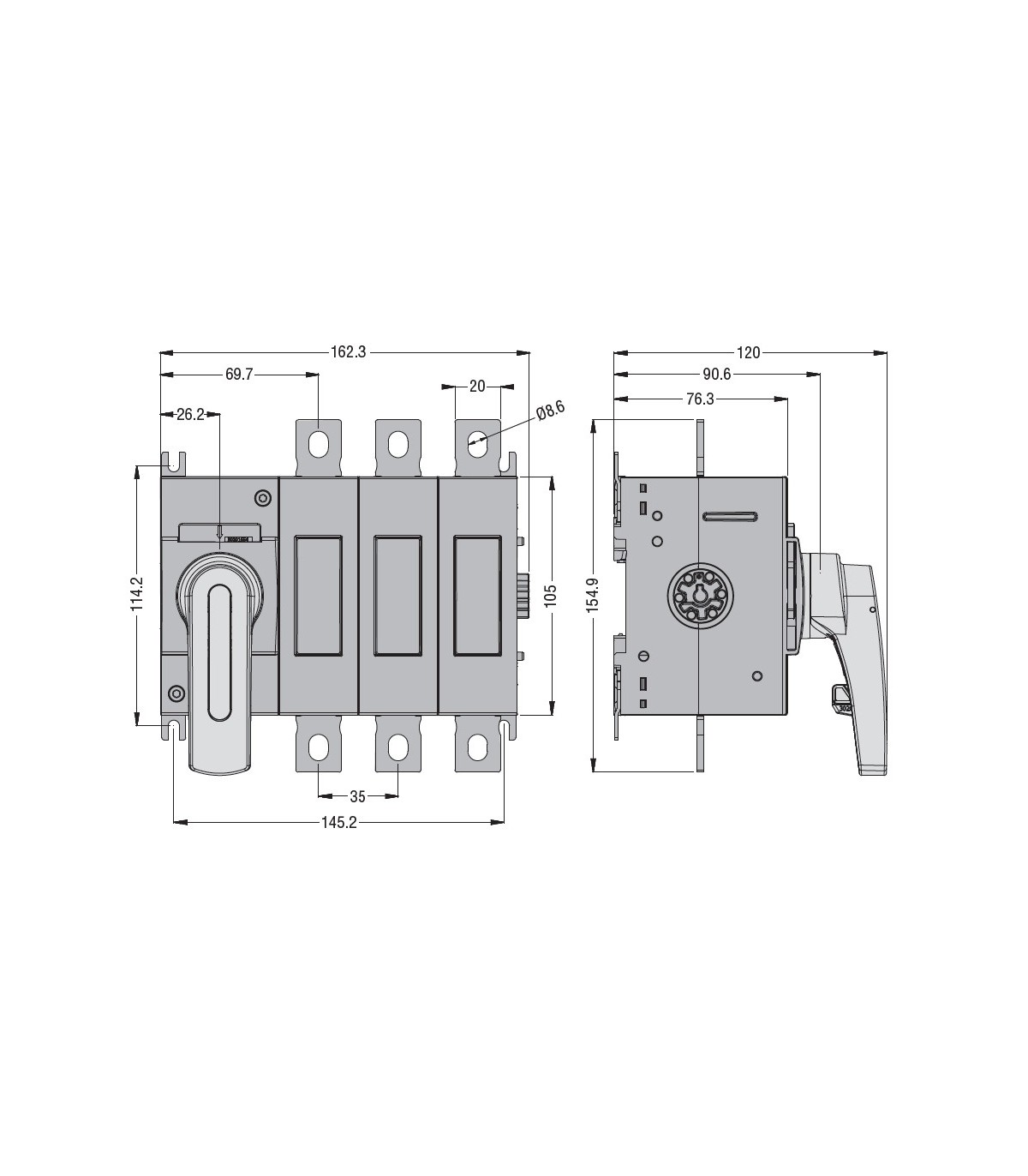 Trennschalter Lovato Dreipoliges IEC-160A, ausführung mit direktantrieb und bolocco tür, zugelassen UL98.