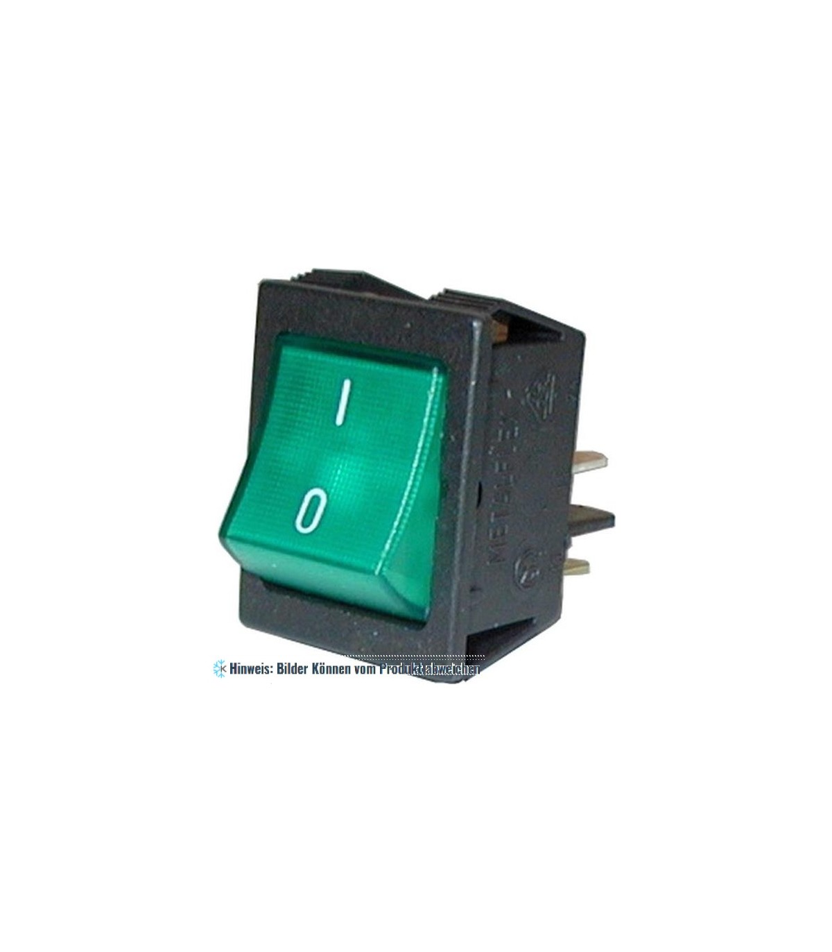 Wippschalter (0-1) 2-polig beleuchtet grün 16A. Abmessungen (LxBxH): 29 x 21 x 29 mm