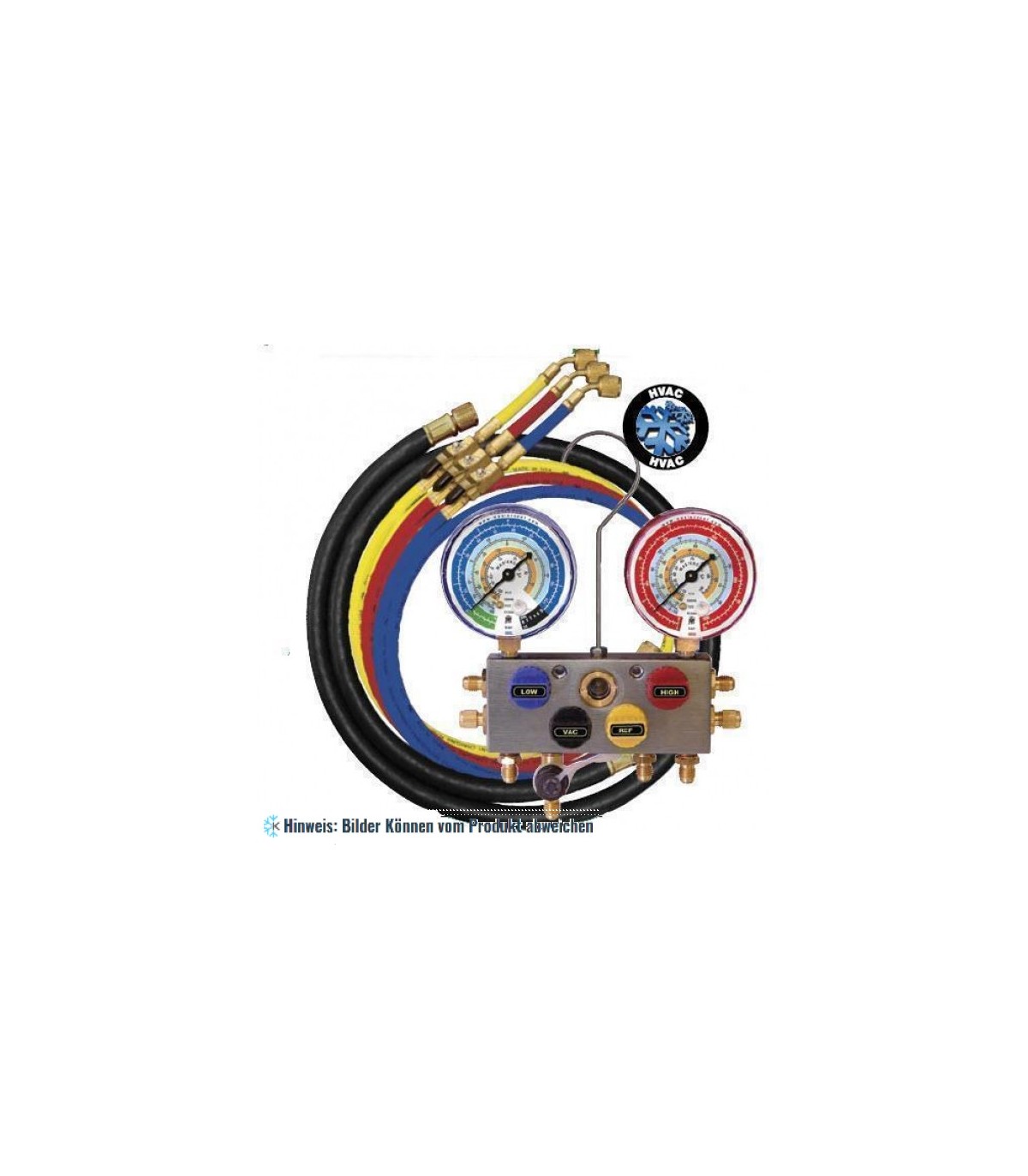 Monteurhilfe-Gehäuse mit Manometern, 3 Stück Füllschläuche, je 150cm mit eingebauten manuellen Absperrventilen (45-49262-60) und 1 Stück Füllschlauch 3/8” - Schwarz-150cm Länge (45-94160).