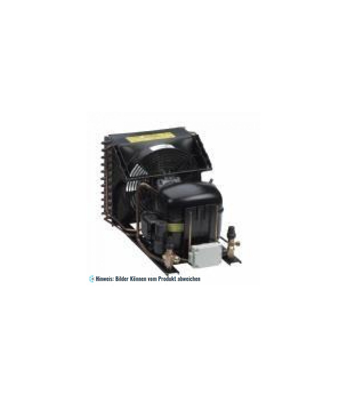 Hermetischer Verflüssigungssatz Danfoss Serie OPTYMA A01 Modelle OP-UCGC011FRA01G (114X0337 - ältere Bezeichnung FR11GXT2 Basic - OHNE Hoch- und Niederdruckschalter im Unterschied zu dem Modell 114X0339 OP-UCGC011FRA04G) ist mit Sammler, 2 Absperrventilen, Montageplatte und Kupferleitungen für KP ausgestattet, eingebauter Kompressor: FR11G, für Niederdruckbereich (LBP) und Kältemittel R134a geeignet. Expansionsventilbetrieb. LBP Temperaturbereich: -35 bis +5°C. Kälteleistung (-5°C): 612 W. Luftmenge: 620 m3/h. 1 Lüfter D= 230 mm. Stromaufnahme Lüfter: 0.25 A. Schalleistungspegel: 61.5 dB. Bördel-Anschlüsse: 6 mm (Flüssigkeitsleitung) x 8 mm ( Saugleitung). Versorgungsspannung: 230V/1F/50Hz. Abmessungen: 275 mm x 400 mm x 530 mm