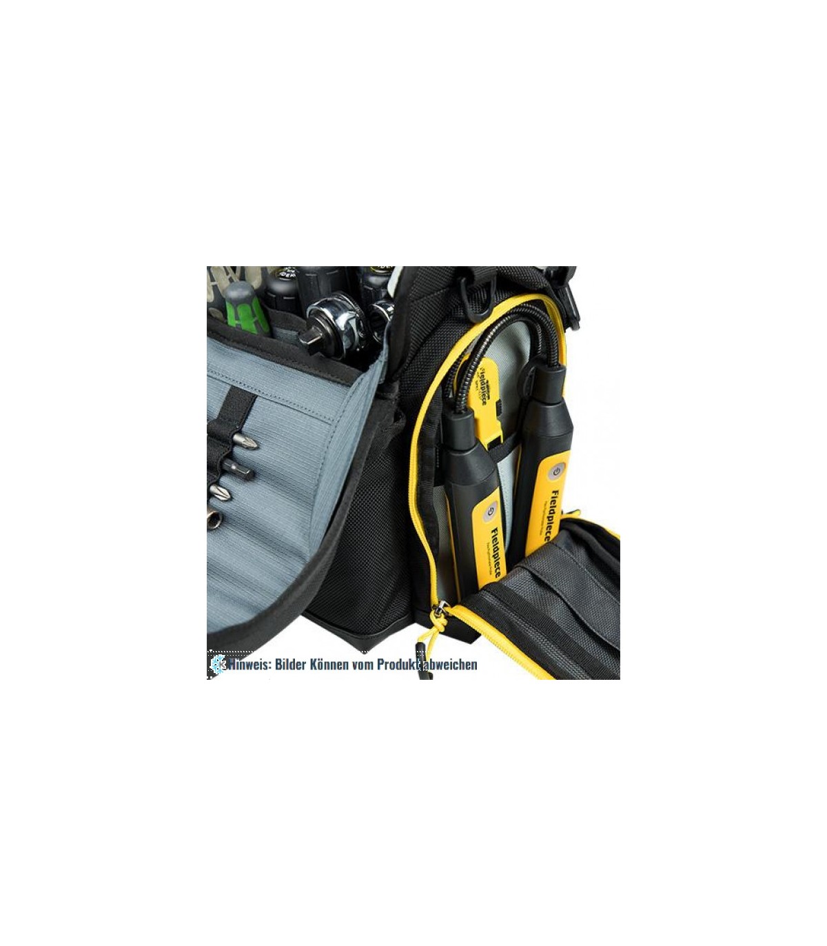 Schrankschrauben und Unterlegscheiben werden von der stark magnetischen Schale festgehalten, sodass sie nicht verloren gehen. Separate Fächer im Inneren der Tasche sorgen dafür, dass alles an seinem Platz bleibt. Seitentaschen mit Reißverschluss und ein großes verstellbares Innenfach schützen Messgeräte vor den Handwerkzeugen.