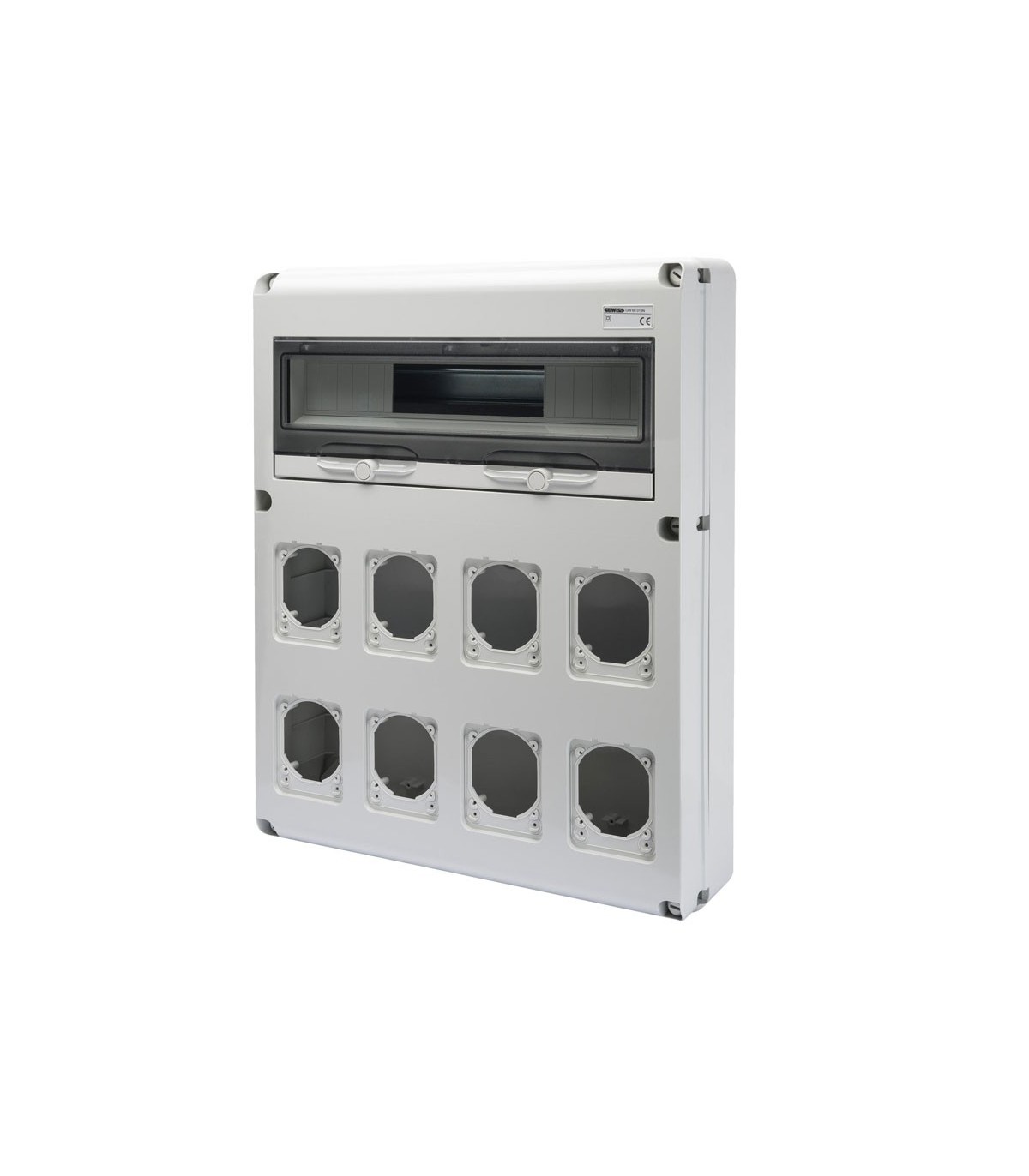 Gewiss-Schaltschrank, 20 Module mit 8 Flanschen für Industriesteckdosen.