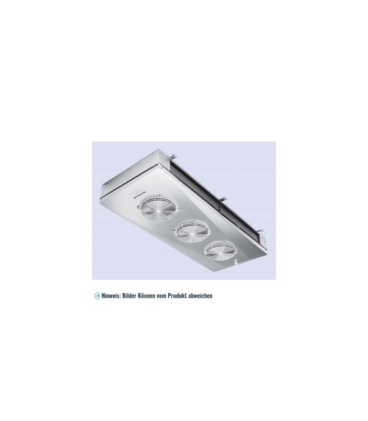 Doppeltausblasender Luftkühler ECO DFE 35EL7ED, mit elektrischer Abtauung für hohe Temperaturen bis +2°C finden ihre Anwendung in niedrigen Kühlzellen für die Aufbewahrung von Frisch- und Tiefkühlrodukten. Die Motorventilatoren der Modelle sind mit zwei Drehzahlen ausgestattet, was ermöglicht das gleiche Gerät für eine normale oder eine verringerte Belüftung (geräuscharm) einzusetzen. Lamellenabstand: 7 mm. Leistung: 6,42 kW. 5 Lüfter d=315 mm. L/H Luftstrom: 6000 m3/h / 7750 m3/h. L/H Wurfweite: 2x10 m / 2x13 m. Wärmeaustauschfläche (innen/außen): 6,9/38 m2. Anschlüsse: 12 mm (Eingang), 35 mm (Ausgang). Tauwasserabfluss: 1”. Netzspannung: 400V/3F/50Hz.