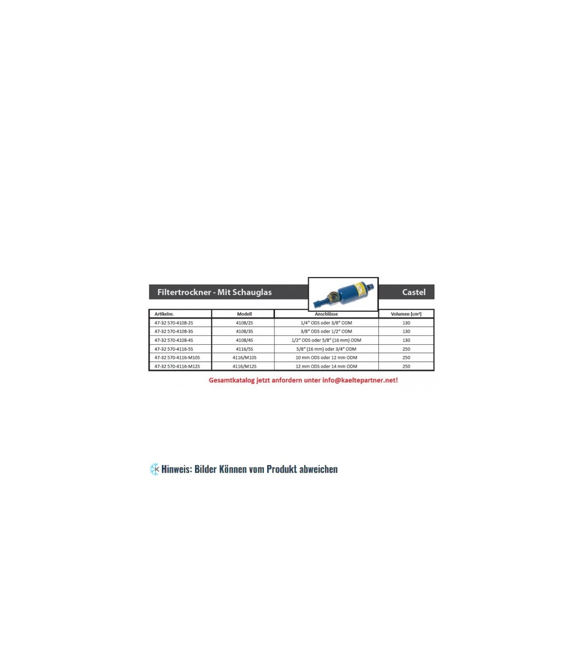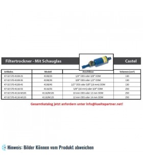 Filtertrockner 4116/M10S Castel mit Schauglas, Anschlüsse 10 mm ODS, 12 mm ODM, Volumen 250 cm3. Filtertrockner 100% Molekularsieb, mit Flüssigkeitsindikatoren, Lötanschlüsse.