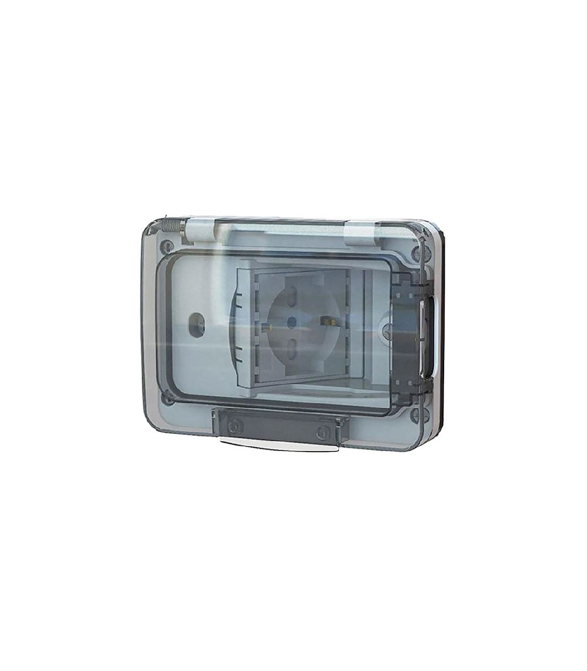 4Box WIDE Gehäuse mit Schukosteckdose, Farbe: weiß, mit öffnender Tür, mit Schutzart IP55 auch bei eingestecktem Stecker und geschlossener Tür. Kompatibel mit Vimar Plana, Gewiss Chorus.