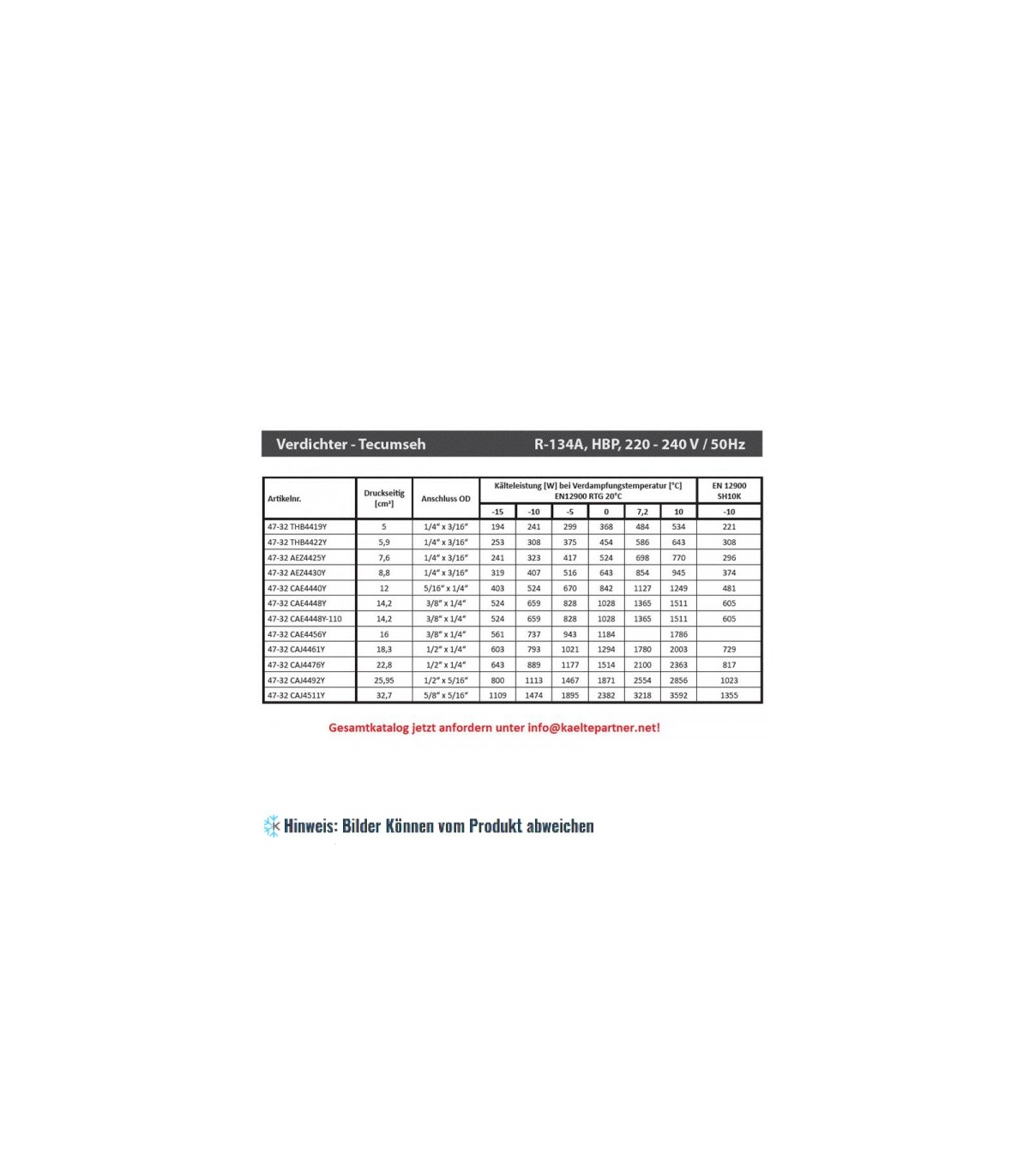 Kompressor/ Verdichter Tecumseh CAJ4511Y Öltyp (POE), HBP - R134A, Spannung 220-240V/1/50Hz, Anlaufstrom LRA 30A, Motortyp CSR, Expansionsventilbetrieb, Hubvolumen 32,7 cm3. Anschlüsse 5/8” x 5/16”.