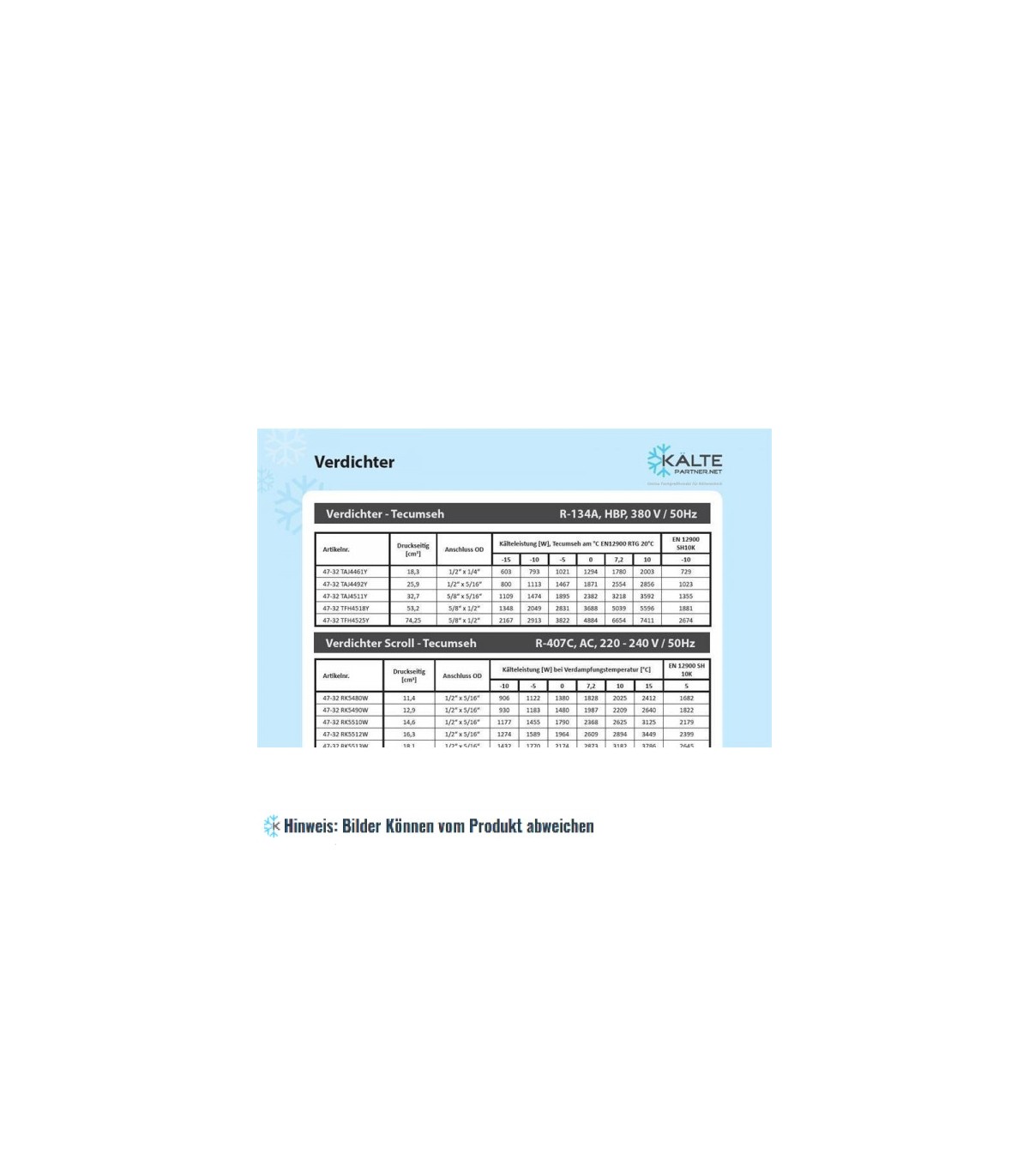 Kälteleistung gemessen für Kondensationstemperatur 54,5°C, Sauggastemperatur 32°C, Messbedingungen: EN12900 RTG 20°C