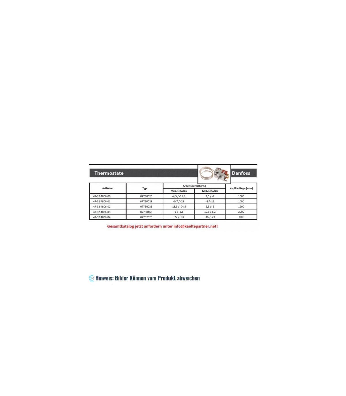 Thermostat 077B0033 Danfoss, Kapillarrohrlänge 1200 mm, kalt ein -13.5°C, kalt aus -24.5°C, warm ein 2.5°C, warm aus -5.0°C. Thermostat für Kühlschränke. Funktion: Normal und Normal mit automatischer Abtauung. Service Thermostat.
